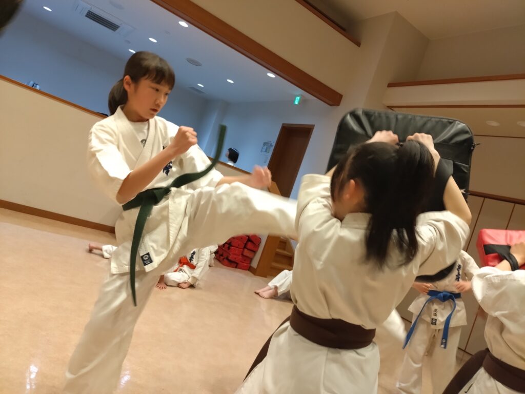 上段回し蹴りをテーマに打ち込み、約束組手。