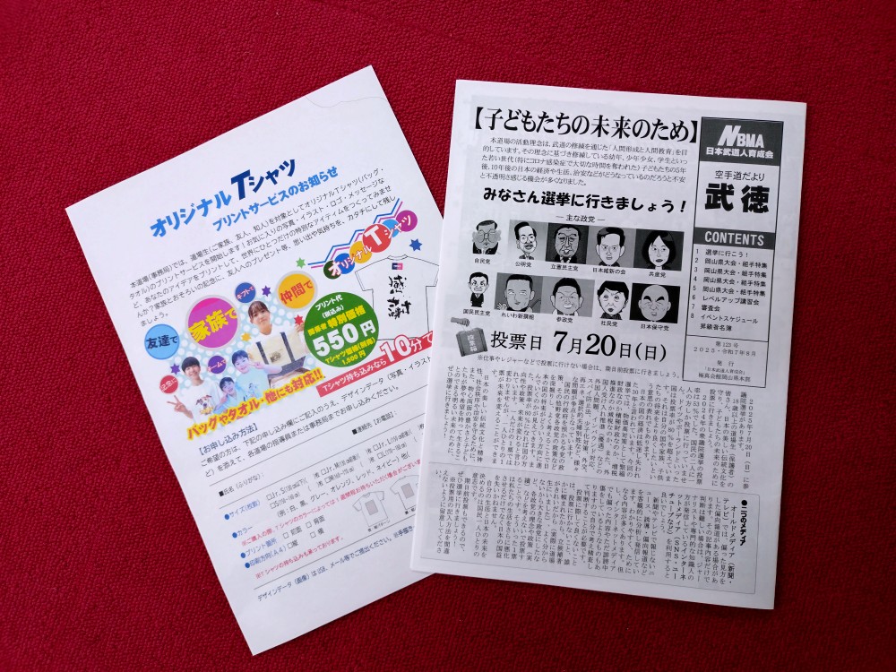 Tシャツプリントサービスの案内を配布…例えば、南方道場Tシャツを作って試合会場で着たら?とか提案。