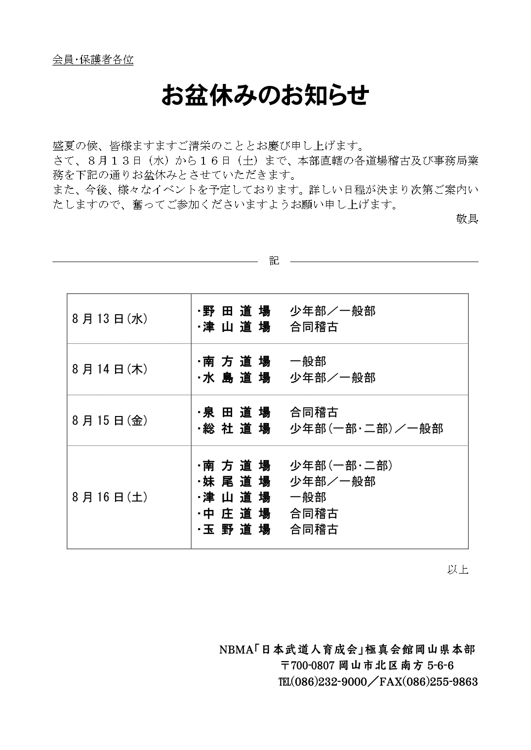 小学生は終了 中学生以上…自由組手/鍛錬補強