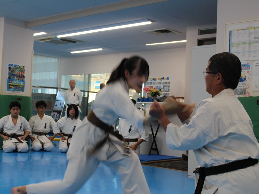 一次審査の日、平安五でバランスを崩してしまいとても悔しかったです。それでも何とか一次審査を通過し、二次審査に向けて組手を中心に稽古するようになりました。木曜日の南方の稽古にも参加するようになり、会長師範や有段者の先輩方に熱心に指導していただき、課題を指摘されました。家や稽古でも体力トレーニングやミット打ちをしたり、自分から突きなどで攻めたり、左の蹴り技を使うことや技を繋げることなどたくさん、教えていただきました。